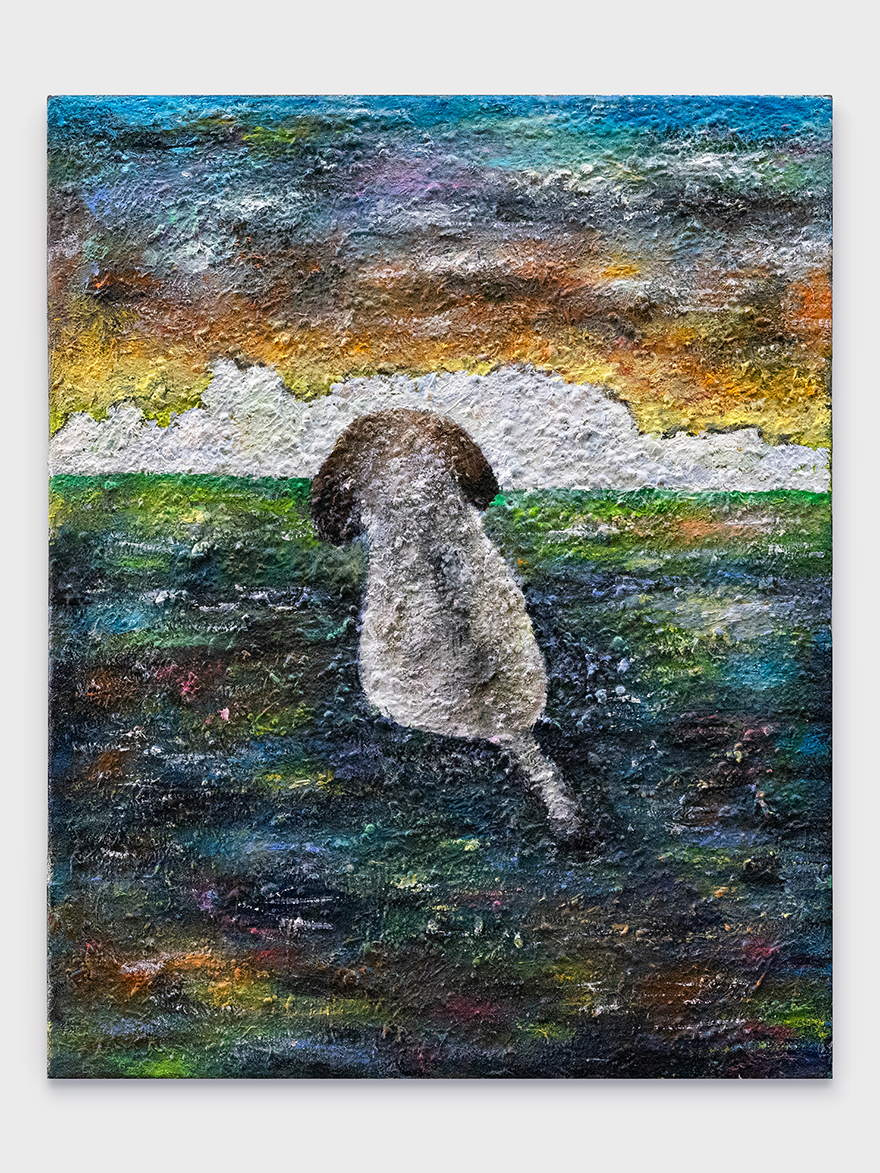 这些形象乍一看是稚气、可爱、孩子气的,但对这些形容词的理解容易流于固化,所以我不得不谨慎地使用它们。在《流动的风景》(Moving Pictures,2023)中,层层叠叠的彩虹颜料地质层似的纵向铺展,如云如海,光泽流转、摇晃;尤其是画面中水平线下半部,仿若宽厚的水体,而坐于其上的一只棕耳小狗背对着我们。它是那么情感充沛、活生生的,惹人怜爱、与世无争。