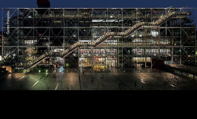 蓬皮杜中心位于塞纳河右岸的博堡大街,前身是活跃了一百多年的巴黎中央市场,在市场搬迁后一度用作停车场,直至 1971 年被市政规划为一处全新的大型文化设施。蓬皮杜的诞生语境,是二战后法国去殖民、劳资关系、女性权力进入激烈讨论与演变的环境,个人在社会中的角色也成为重要的议题。蓬皮杜的全名是乔治 · 蓬皮杜国家艺术文化中心,以纪念法国前总统乔治 · 蓬皮杜而得名。蓬皮杜的建筑设计来自意大利的伦佐 · 皮亚诺(Renzo Piano)和英国的理查德 · 罗杰斯(Richard Rogers),当年,他们的方案从 681 个来自国际的方案投稿中脱颖而出。他们极富野心而又创造性的建筑设计,承载了蓬皮杜的综合功能:集工业创造中心、图书馆、美术馆与音乐研究中心于一身。整座建筑占地 7500 平方米,建筑面积共 10 万平方米,是巴黎规模最大的美术馆。