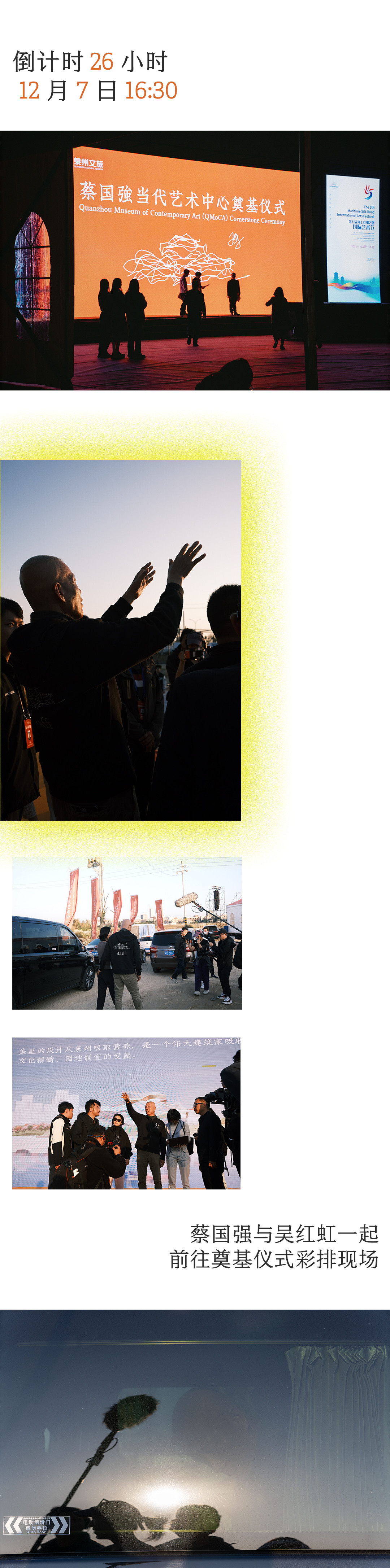 奠基仪式彩排时,刀旗如帆,当代艺术中心的名号迎风飘扬。**他来到沙地上临时搭建起的舞台边,先细心地蹬掉鞋底的沙土,继而出乎所有人意料地双掌撑地翻了个筋斗。**小时候练功夫的身板儿至今还硬朗,修长的身形是他保持野生的法宝之一,亦是蔡国强之为蔡国强的 “品牌形象”。
