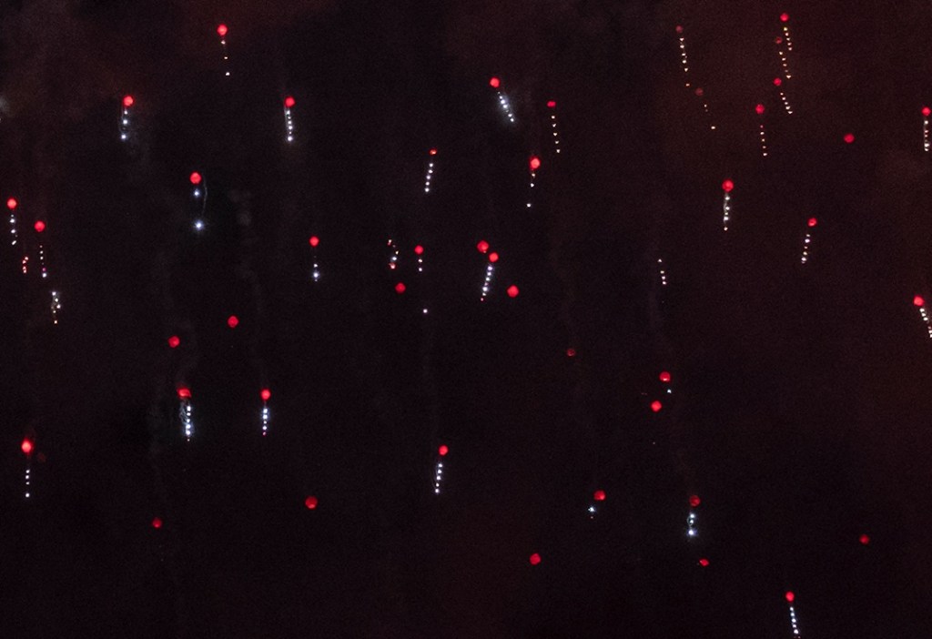 1100 架无人机在黑暗中形成盖里手稿与签名阵列。宽 290 米、高105 米手稿消失于夜空,又变换出宽290 米、高120 米的建筑。1100 发爆裂筒管从左向右连续点火,之后 1100 发爆裂烟花同时点火。