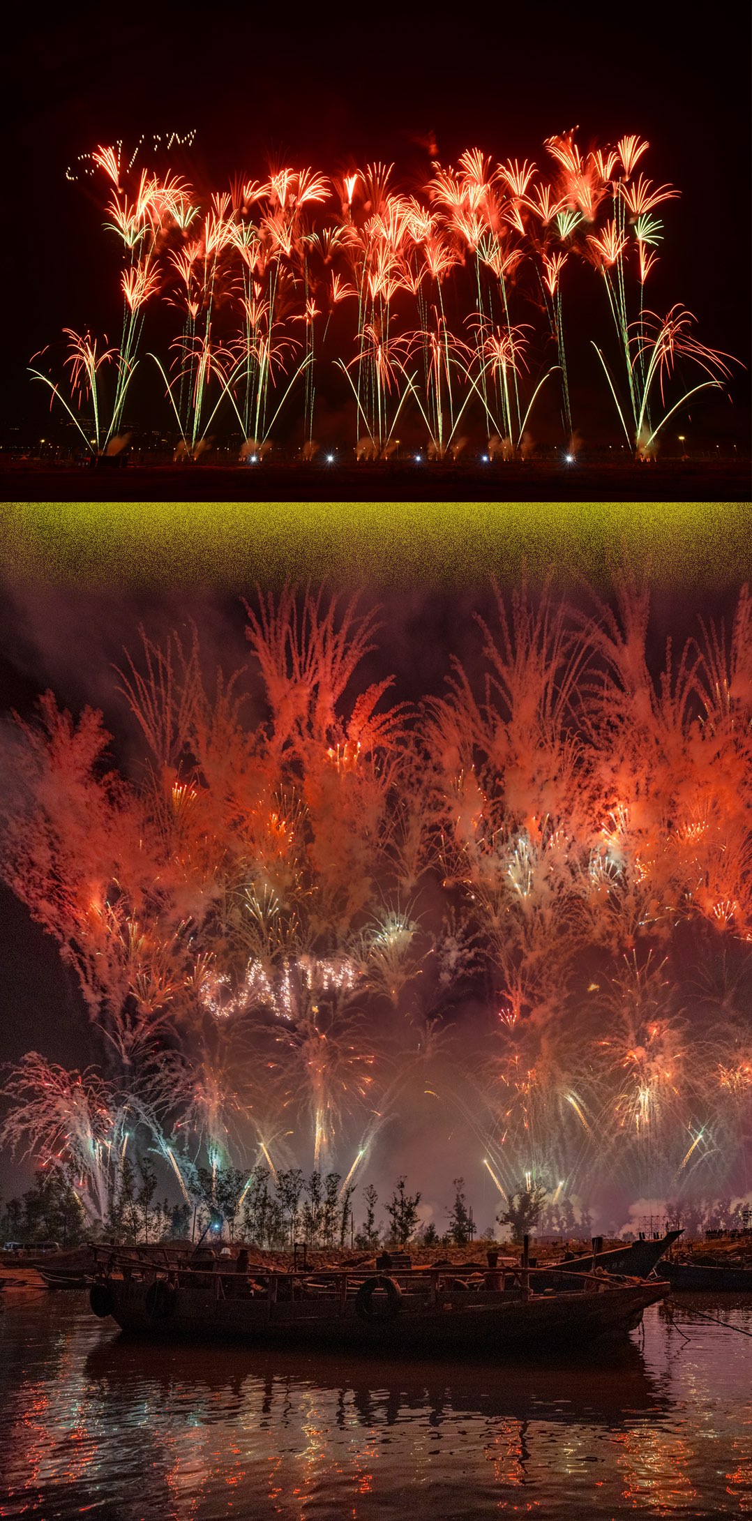 蔡国强,《海市蜃楼》第四幕:满城尽开刺桐花,2023。上图由棠花烟花提供;下图由顾剑亨摄,蔡工作室提供