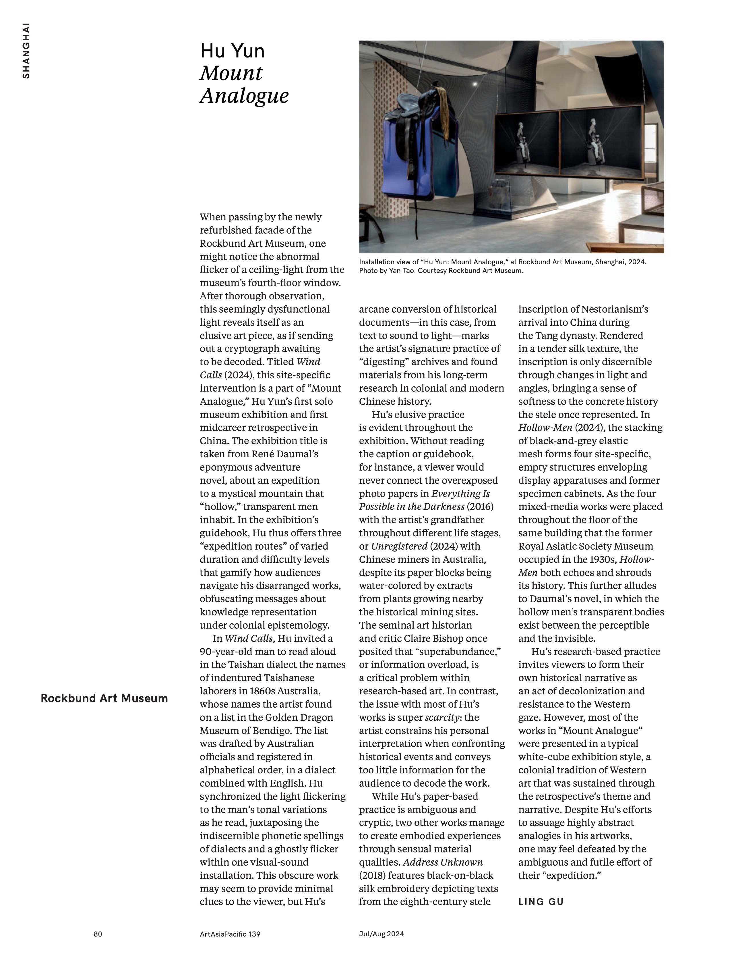 When passing by the newly refurbished facade of the Rockbund Art Museum, one might notice the abnormal flicker of a ceiling-light from the museum’s fourth-floor window. After thorough observation, this seemingly dysfunctional light reveals itself as an elusive art piece, as if sending out a cryptograph awaiting to be decoded. Titled Wind Calls (2024), this site-specific intervention is a part of “Mount Analogue,” Hu Yun’s first solo museum exhibition and first midcareer retrospective in China. The exhibition title is taken from René Daumal’s eponymous adventure novel, about an expedition to a mystical mountain that “hollow” transparent men inhabit. In the exhibition’s guidebook, Hu thus offers three “expedition routes” of varied duration and difficulty levels that gamify how audiences navigate his disarranged works, obfuscating messages about knowledge representation under colonial epistemology.