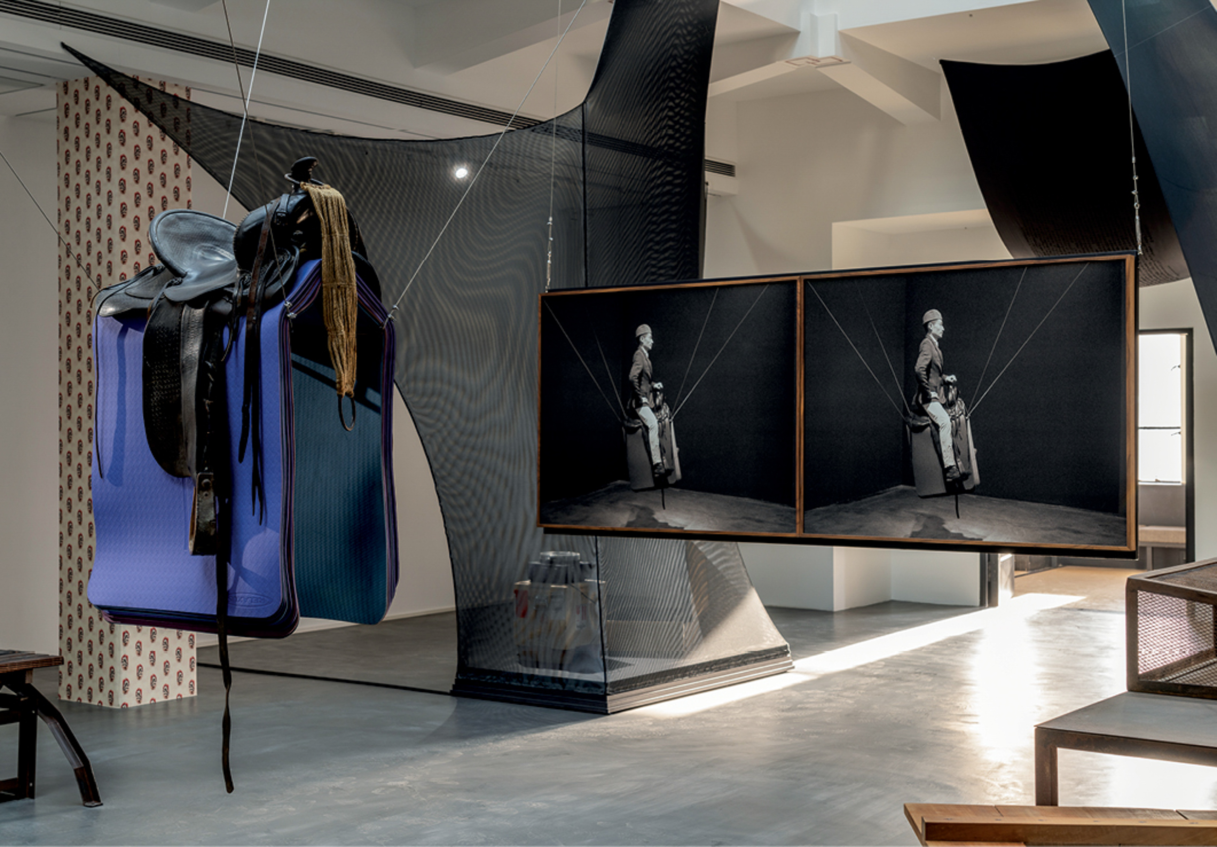 While Hu’s paper-based practice is ambiguous and cryptic, two other works manage to create embodied experiences through sensual material qualities. Address Unknown (2018) features black-on-black silk embroidery depicting texts from the eighth-century stele inscription of Nestorianism’s arrival into China (circa the Tang dynasty). Rendered in a tender silk texture, the inscription is only discernible through changes in light and angles, bringing a sense of softness to the concrete history the stele once represented. In Hollow-Men (2024), the stacking of black-and-grey elastic mesh forms four site-specific hollow structures enveloping display apparatuses and former specimen cabinets. As the four mixed-media works were placed throughout the same floor, of the same building, that the former Royal Asiatic Society Museum occupied in the 1930s, Hollow-Men both echoes and shrouds its history. This further alludes to Daumal’s novel, in which the hollow men’s transparent bodies exist between the perceptible and the invisible.