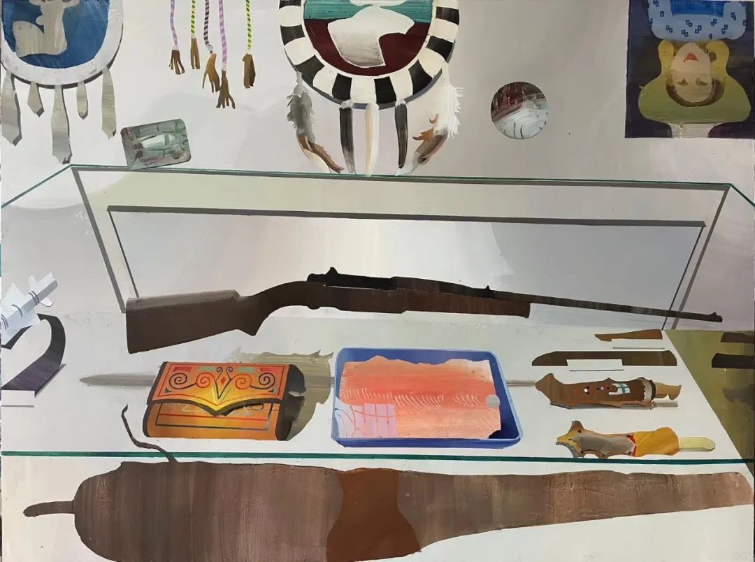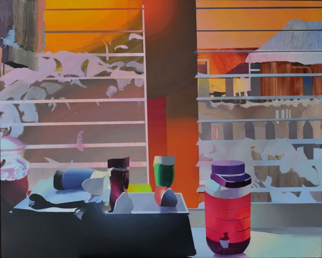 在《敖鲁古雅之窗》(2024)的右侧,百叶窗外,木屋的墙面上是一笔大刷子棕色的垂直线条,中间被一条横向的浅灰色百叶窗棱利落地切开。盖在木屋上的雪顶像粗粝的混凝土肌理,垂在房檐的部分似乎是染上了夕阳的红霞,毛毛剌剌地裹着樱粉色。