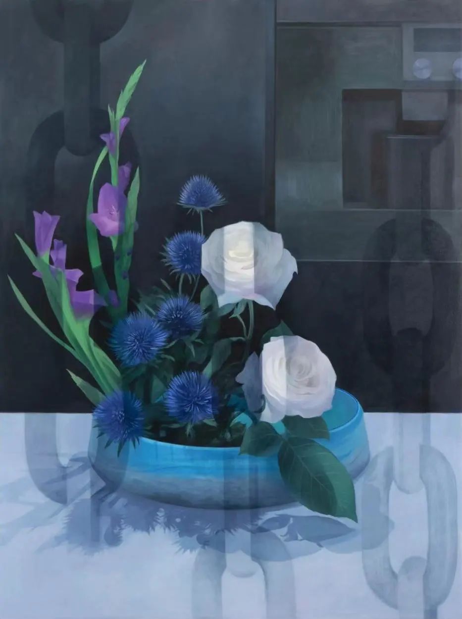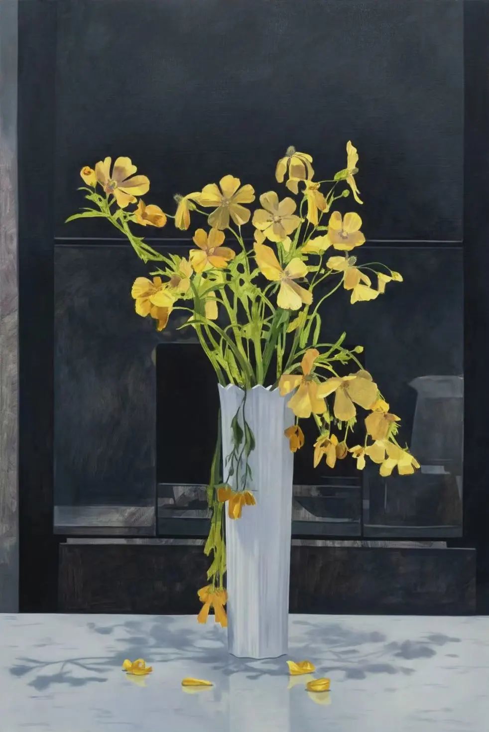 在 “母女合作系列” 的最新一张《笑姐的魔法调料》(2024)里,体现出黄宝莹一以贯之的构图:画面中间是花,摆花的大理石台子都是家里的同一张,背景里玻璃窗的倒影也差不多。这些画全部基于黄宝莹母亲在深圳家里拍的插花的照片。“画这个系列的过程确实有点像母女之间的心理疗程,两个人一起做这件事的过程,交织着沟通、欣赏、感谢等温热的情感。”黄宝莹略带羞赧地说道。