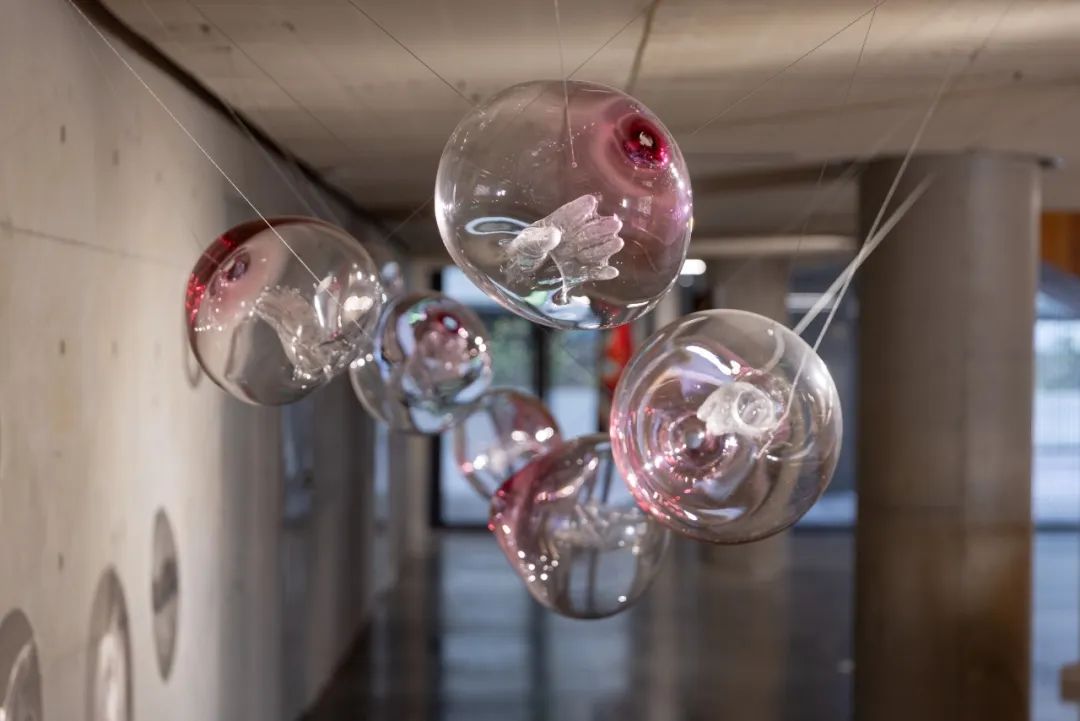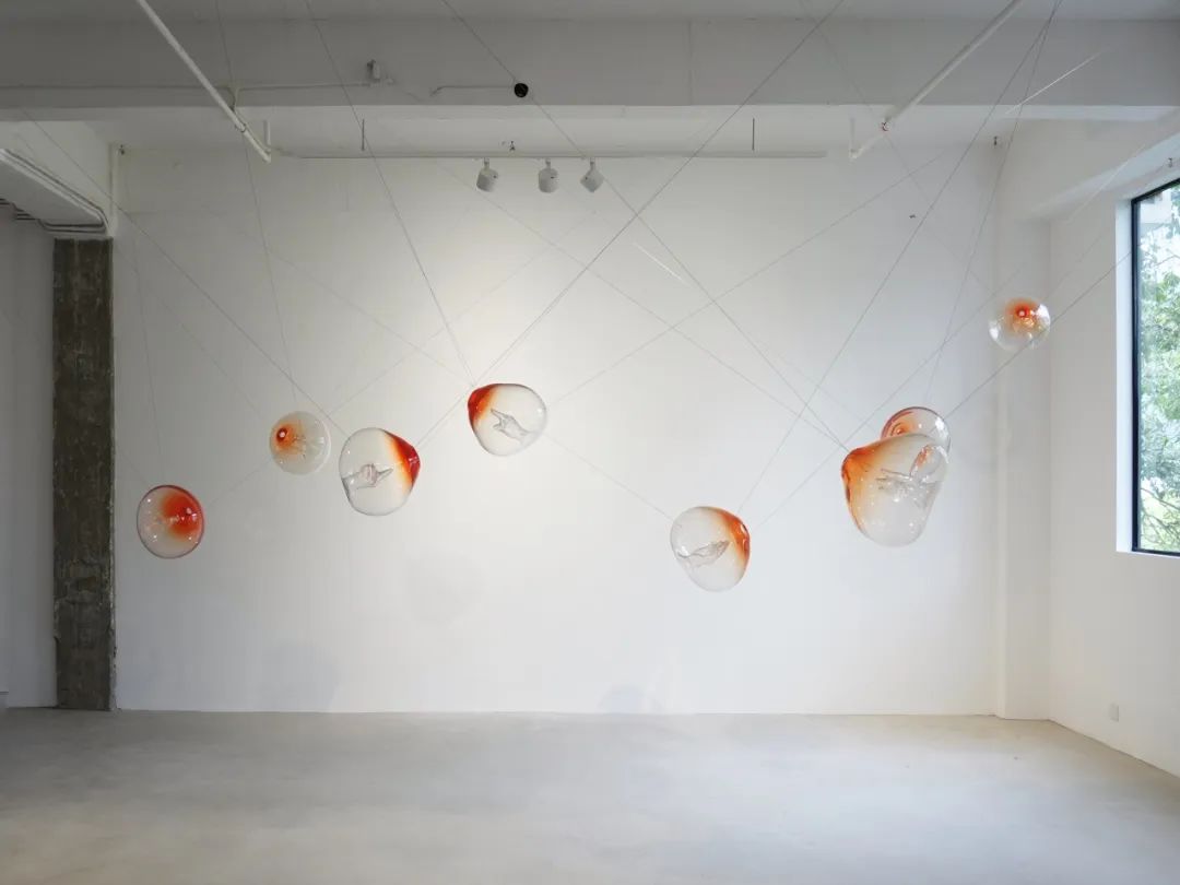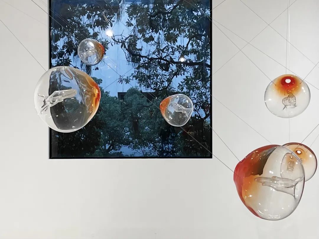 在一排排庞大的缫丝机器前,女工们手指灵巧翻飞,将蚕丝熟练地从蚕蛹身上剥离出来、打结、理清。工厂里,一个女工同时负责四五台机器,这让她们的双手始终忙碌着。蚕丝极轻又细,远看仿若无物,女工们的一双双手好像在摆弄空气。这种独特的视觉让谢文蒂设想到中空 “手” 的玻璃泡:先邀请女工们出任 “手模”,以缫丝动作的手势翻模,再用玻璃吹制将手势定格在透明玻璃泡中,看似有形的手其实只有一层轮廓。在展示时,艺术家克服了工艺上的难度,在玻璃泡上打极小的孔,从中穿过三根极细的钢丝绳,通过钢丝绳拉紧后产生的张力让球体“悬浮” 起来,将 “无形之形” 的轻盈力感定格于空间中。