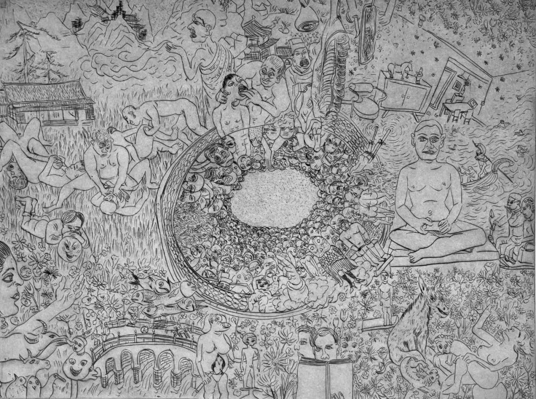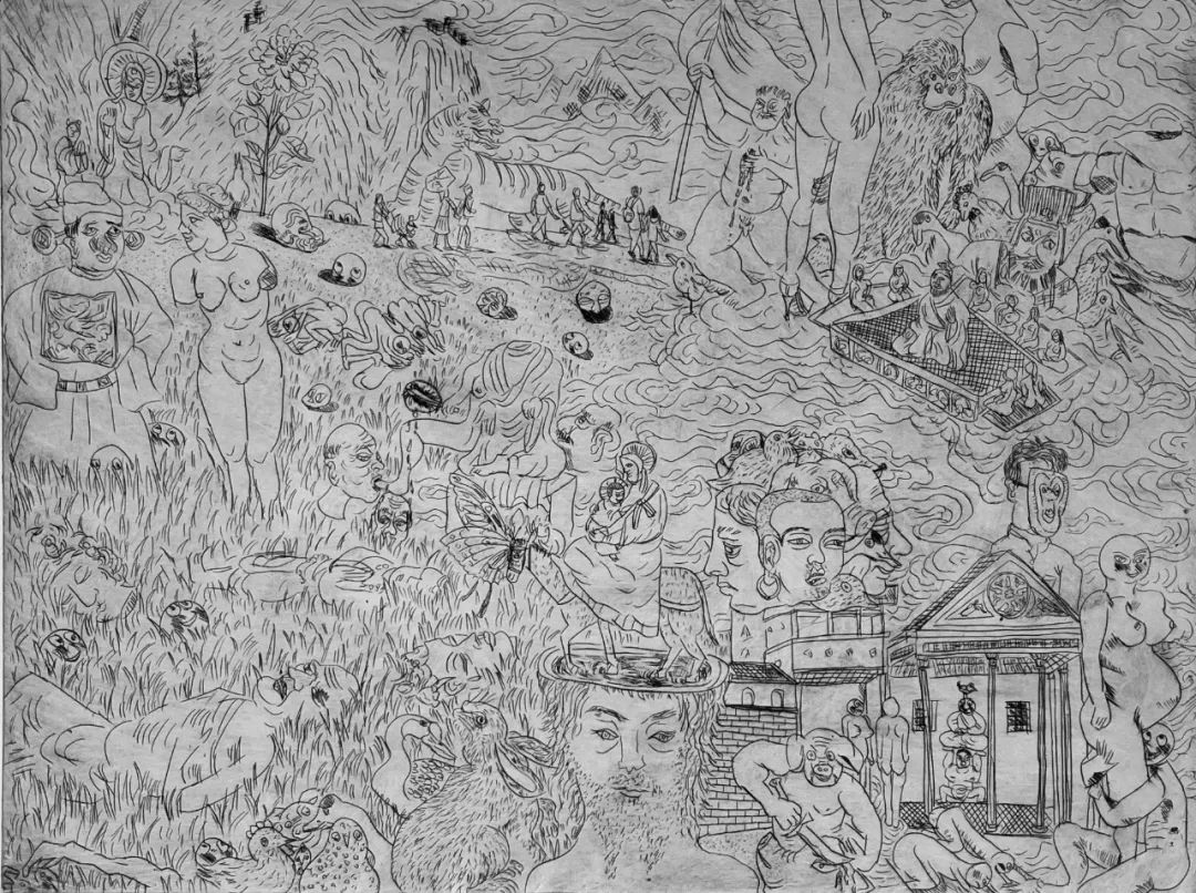 曹应斌在画幅中游刃有余地处理拥挤,这让笔者想到格雷森 · 佩里(Grayson Perry)的陶瓶画和巨幅画毯。但不同于佩里叙事性的画面安排,曹应斌画中比邻相接的元素生长于各自的线条与造型。他说在作画之前,他对画面的结构只有大概的印象,更多是追随画笔,从某一处开始接连铺蔓开来。一张漂浮于毛糙水浪中的佛脸,旁侧横生出一只鹅头与一只兔头;两个高大的裸身人像中间占着一头面貌憨厚的猩猩;猫头鹰人和罗汉像并排而立;猪头人的肚子里露出一颗直视画外的鸟头…… 环环化生,两两相扣,瞬息全宇宙般爆发到画中境界。
