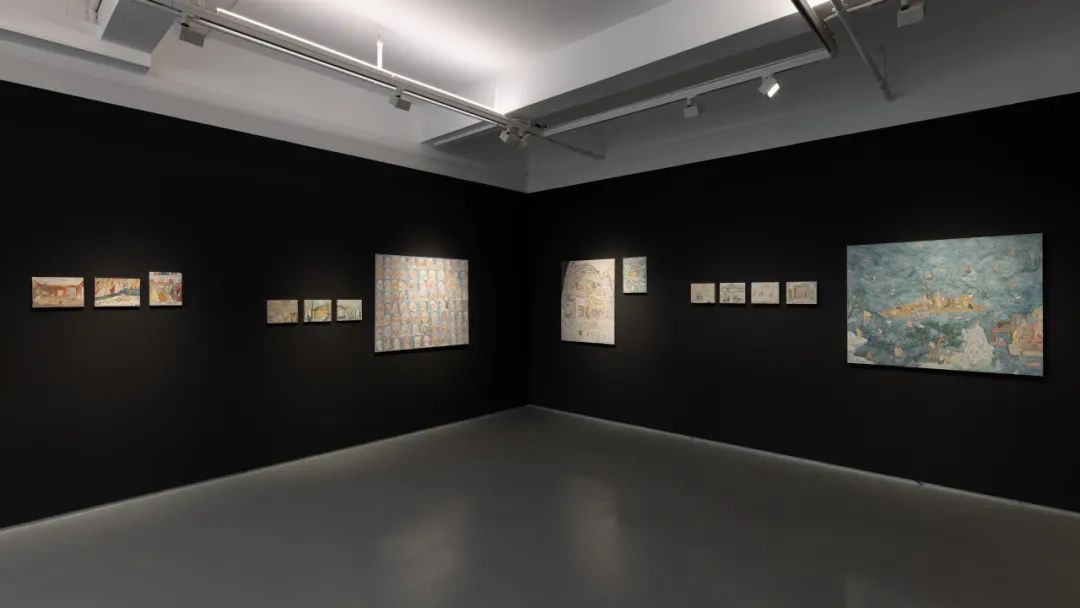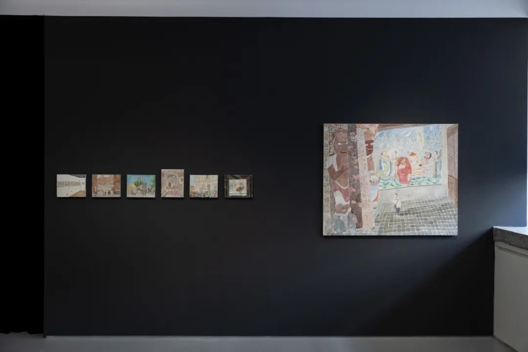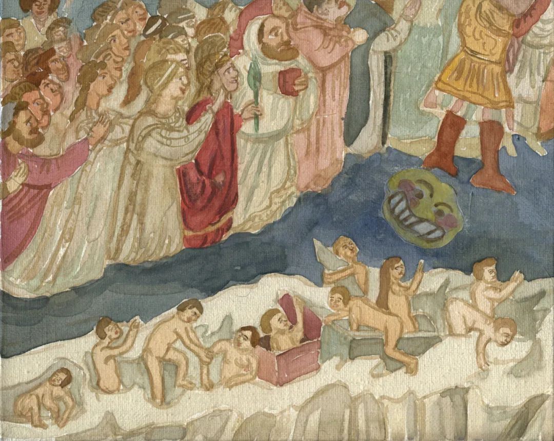 这些水彩画的色调大多是童话插图似的柔和粉嫩,轻巧地将历史感拉近到几乎贴身的距离。地中海的明媚光线直直射入中原地区的清冽空气。恢弘的宗教题材在这些游记般的一瞥中仿佛缩到游戏房的尺度,神性有序的空间打开为错综联通的房间。