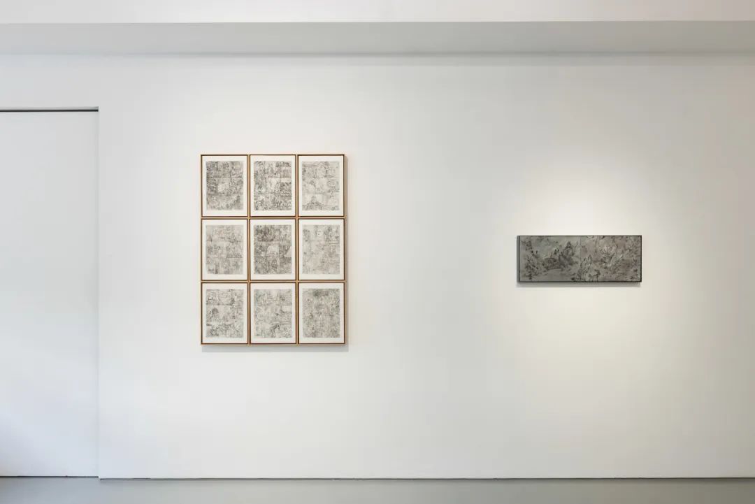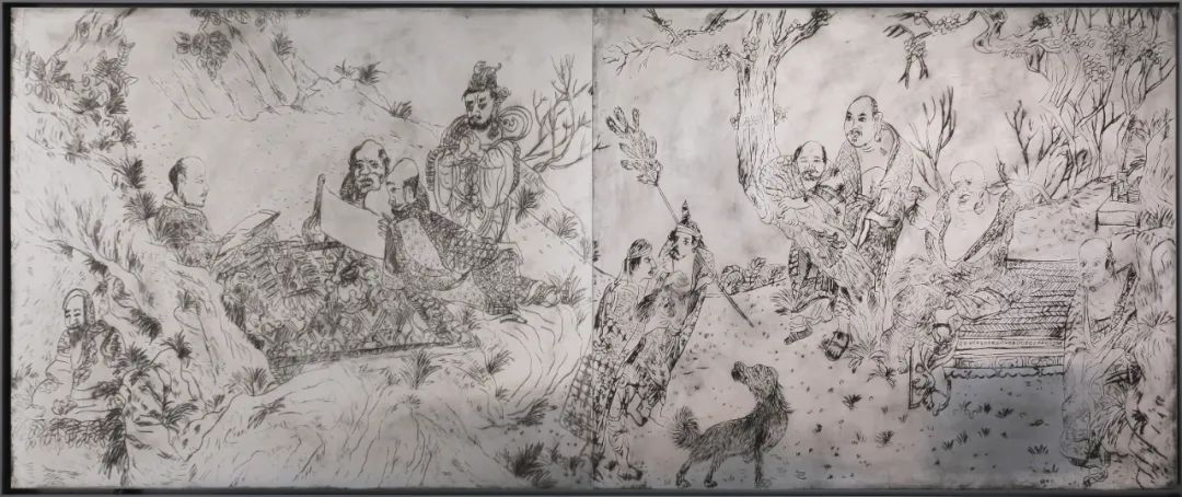 不同于第一个房间的版画,会客室里直接在铝板干刻的《仿石涛十六阿罗应真图》(2023)不是为了拓印的镜像,而以刻刀如画笔般直抒现描。铝板本身却担当了镜的职能,隐隐绰绰地映照出观者的身影,罗汉与老松的线条叠在了这当场当刻的身影之上。
