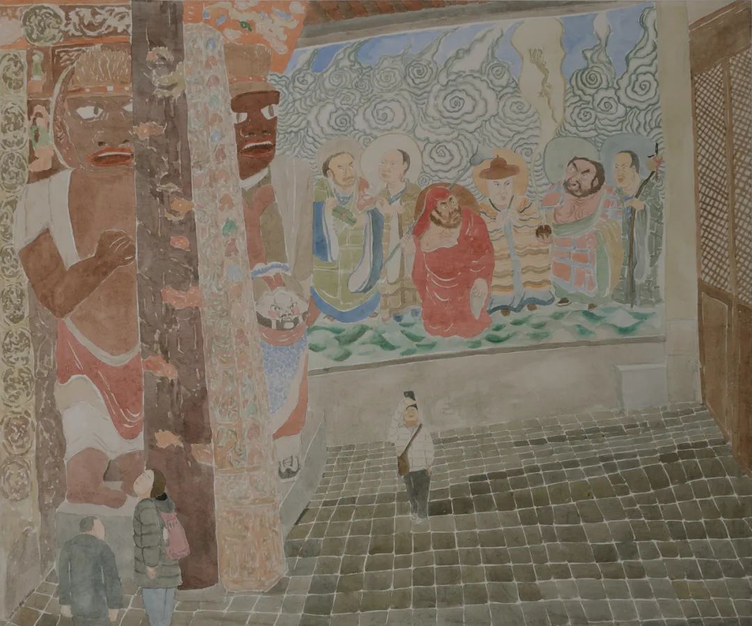 我想,曹应斌是抱着跟很多年前的画匠 / 艺术家交流的平常心走进一间间庙宇和教堂的——不论它们是在山西还是意大利。**他将游历所见的怒目圆睁、悲悯凝眉、虔诚祈祷等种种表情尽数收入囊中,然后摇一摇,摇到这些表情钦铃哐啷作响,再为了某一幅画倒出一些来重新组合。**乔托(Giotto)与安杰利科(Beato Angelico)等文艺复兴前的画家,不像达芬奇和米开朗基罗那样精确细腻地表现形象,但这种略带笨拙的质朴与粗线条,反倒更显得坦诚。类似的大巧藏拙亦适用于中国古代的庙宇画像与造像。