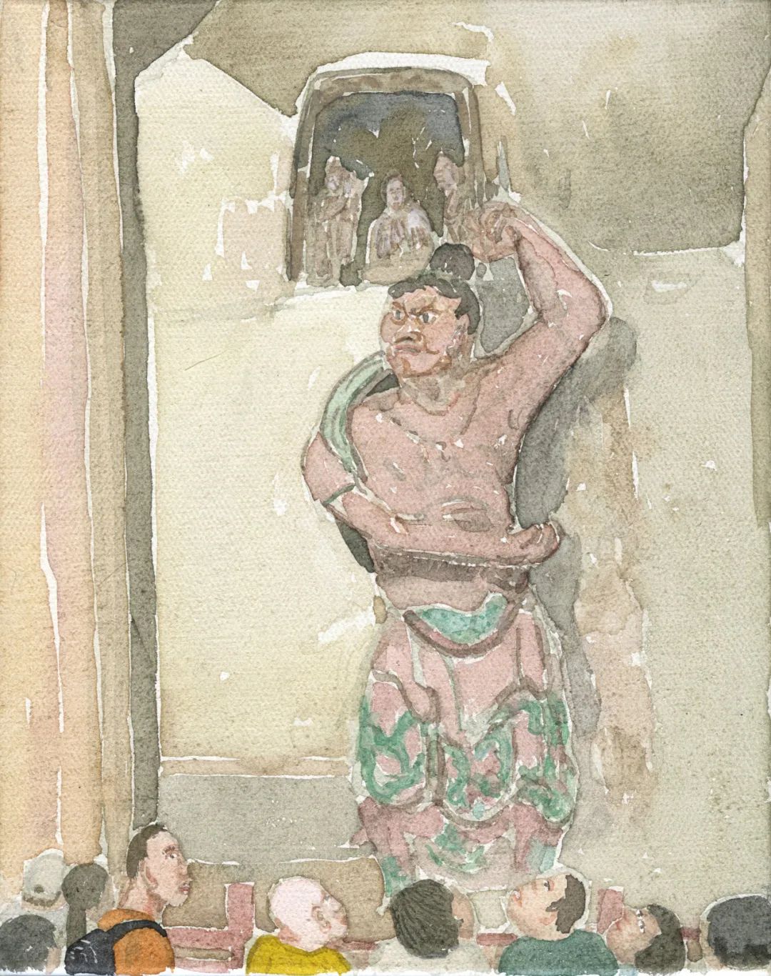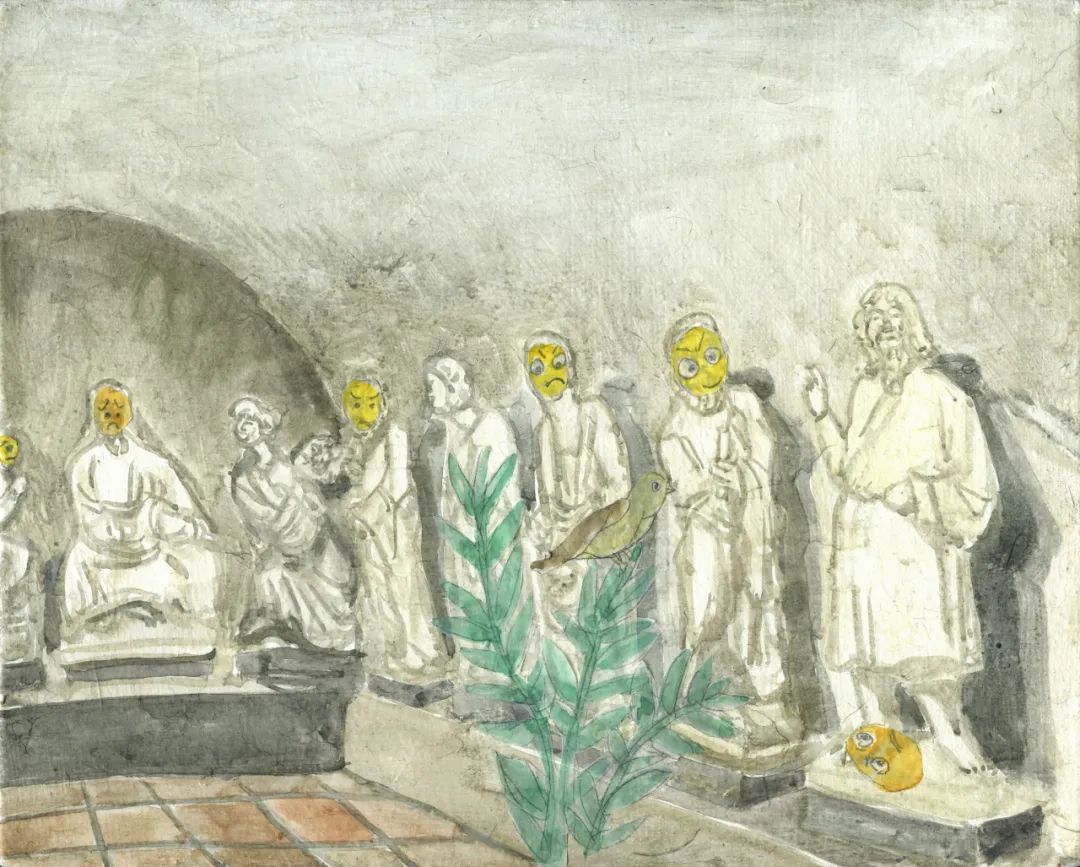 速写式的镜头感与散落着的 emoji 圆脑袋从版画延伸到水彩。佛家经典或圣经故事的场景,同庙宇或教堂的亲身游历同场穿插。记忆中静止端庄的造像们都调皮起来,与相形迷你的当代人们嬉戏。罗斯科曾慷慨地赞美儿童画,那些自带节奏的歪歪扭扭或许也迷人地吸引着曹应斌。
