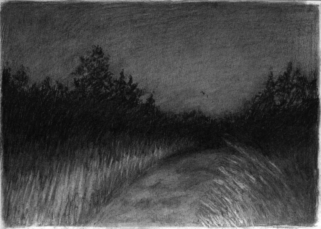 德玛黛为观众设置了手电筒,以此模拟暗夜里的观看。冷冷的风照着林影森森,树木的枝丫遮挡了前路。被汽车远光灯突兀打白的野草露出一截弯道,前方总好像充满了阻碍。皓月与路灯徒劳地反衬出黑的庞大,它无边无际地弥漫;如手电筒般短视的一小段光亮,只够画笔焦躁地记录这同样短暂的一夜,又一夜,不知尽头。