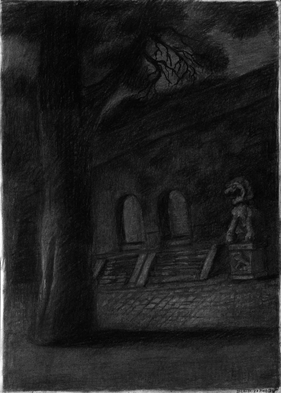 如果整场展览是弦乐四重奏,那么黑房间的炭笔画就像故意走调的中提琴。在那些白昼意味着禁闭的难熬日子,每夜出走的曹应斌用炭笔疾疾捕捉对自由的痛感渴望。