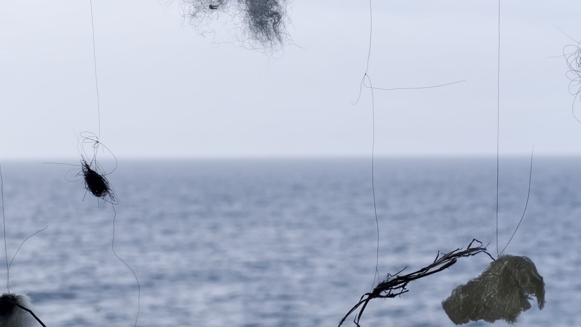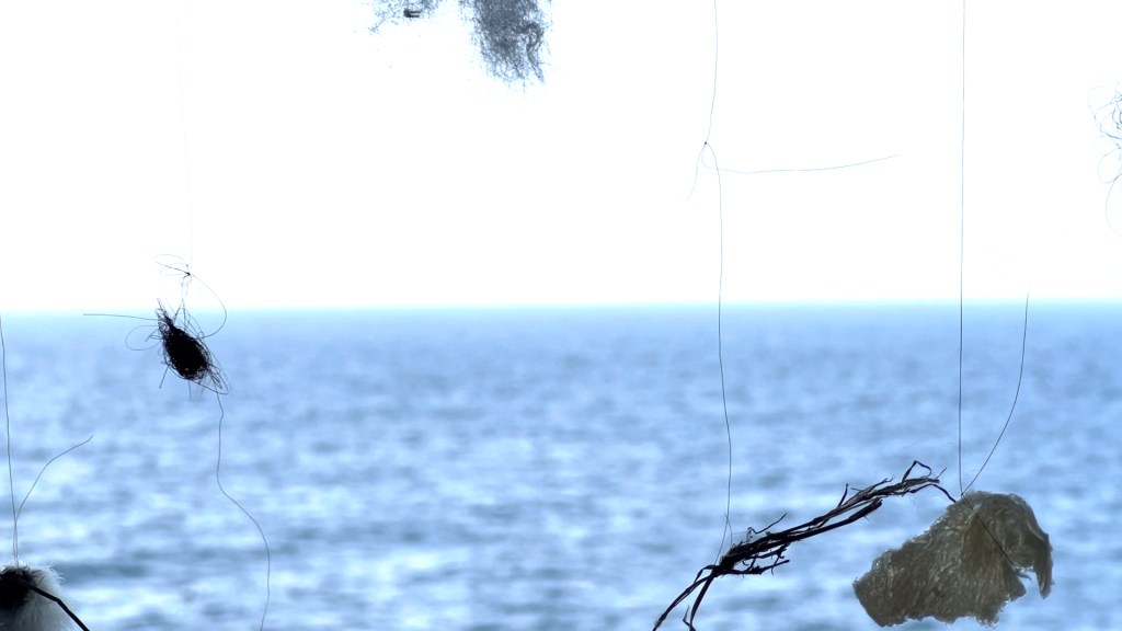 二十年前,晓媛把自己留了多年的长发作为绣线,创作了《送不出去的信物》(2005-2006)、《这101.92建筑平方米》(2005-2006)等。当时的“物料录”(作品说明)列出的材料都与她极其亲密:除了自己的头发,还有她与家人品类繁多的生活物品——筷子、袜子甚至内裤。它们都有明显的使用痕迹,承载着情感浓密的回忆。而在此次展出的影片《放逐志异》(2024)里,头发再出现:先是原本待在摄像机背后的艺术家毫无先兆地裸身立于镜头前,在自己打湿了的肚子上搓一根头发,不紧不慢地把它揉搓成一团。在稍后的另一段画面里,艺术家的两只手严谨地将数根头发两两相接,把比普通棉线更细的发丝灵巧地打出一个个匀致的结,最终做成了一根“发绳”。