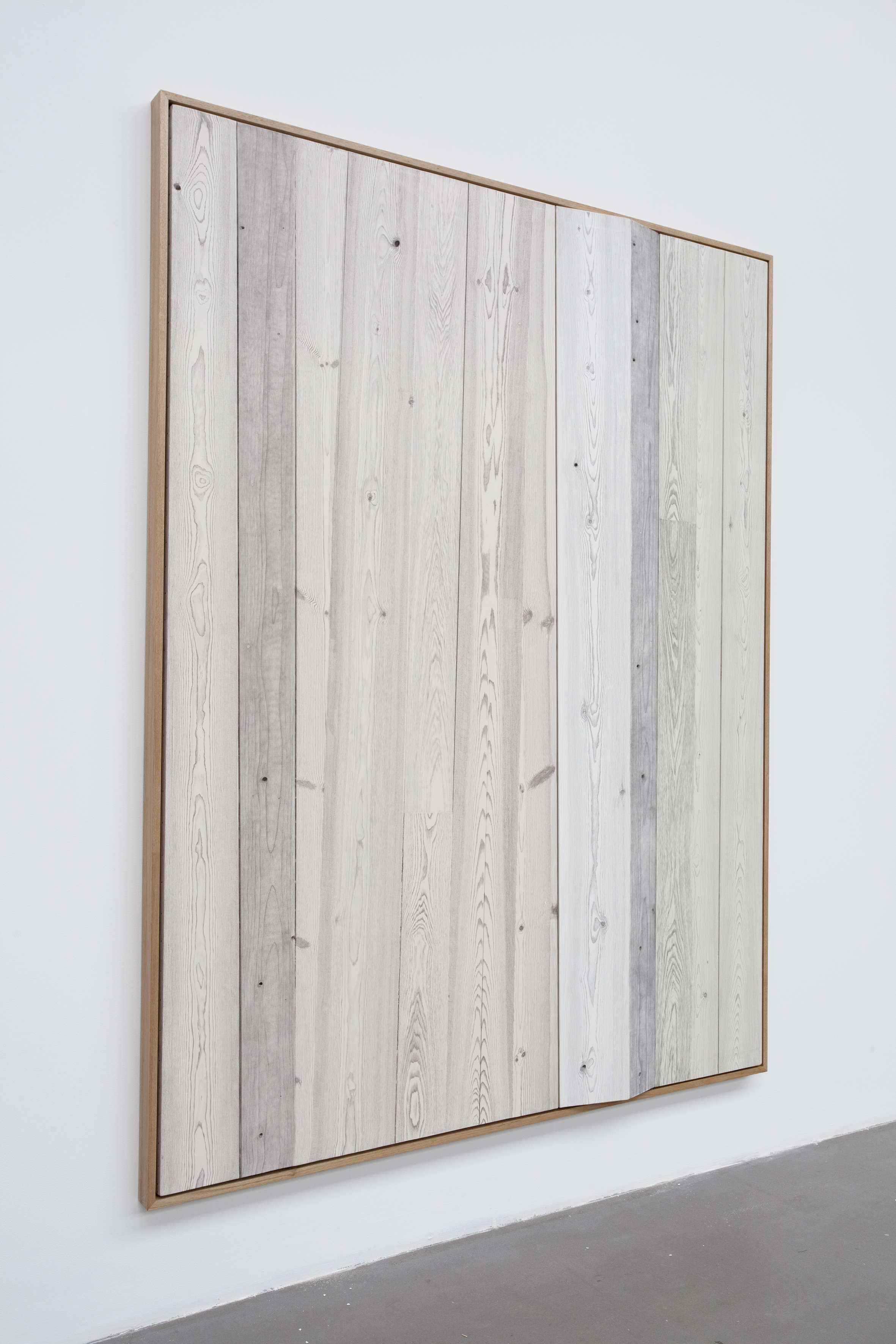 在这演变的过程里,《木/罅 一》(2011)的故事遥遥呼应了晓媛的第一块绡,因为它们都曾遭遇遗忘,并再度“登场”。一块两平米多的巨幅木板曾闲置于工作室的角落长达两年,因日积月累的温湿差而翘起,“形成了一条贯通首尾、截断整个画面的小峰。”它之所以闲置,是因为起初在精心拼接好这前所未试的大体量木板后,晓媛才知道绡的最大幅宽只有一米四;而对当时的她来说,绡是无法拼接的。要做一件大“木”的兴致冲冲就此嘎然而止,直到小峰成为自然的“缝隙”,让她能将三片生丝看似一体、实则独立地绷在木板上。晓媛写道:“时间、过程、停顿和我一起完成了它。”