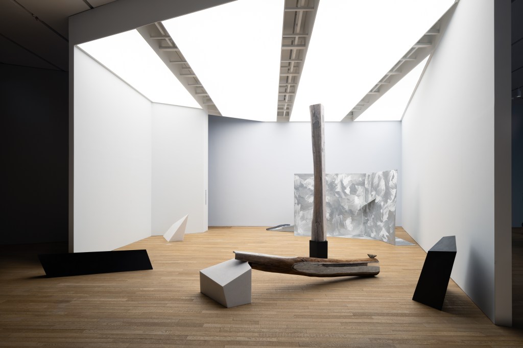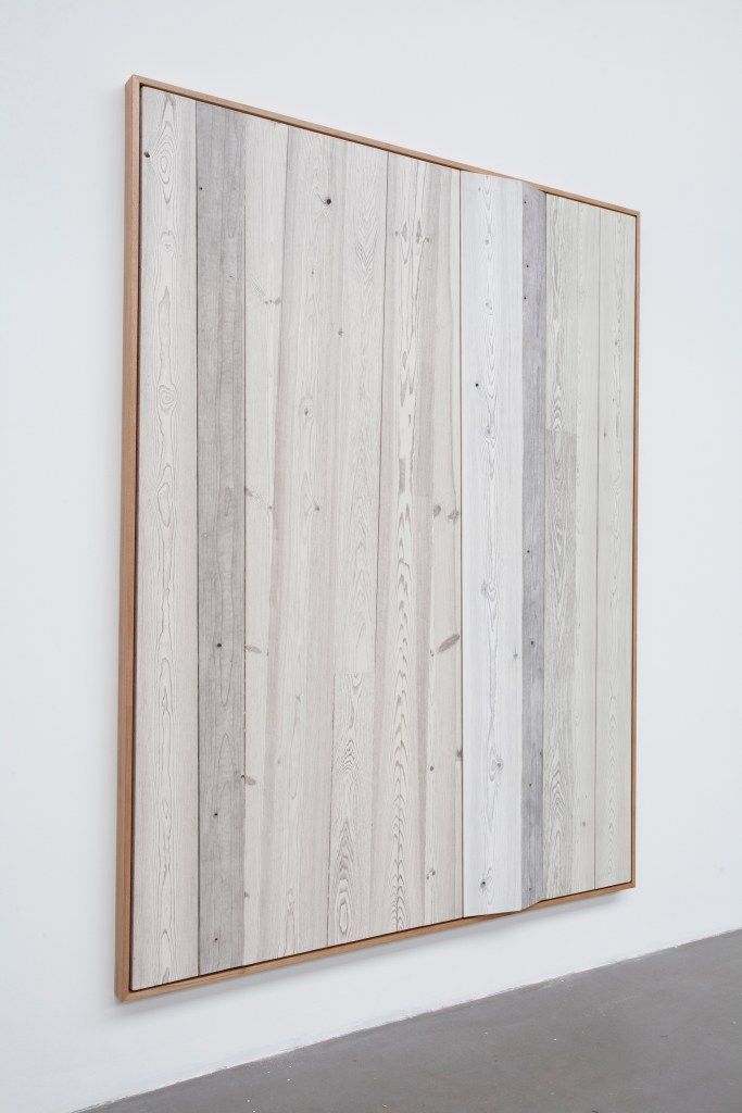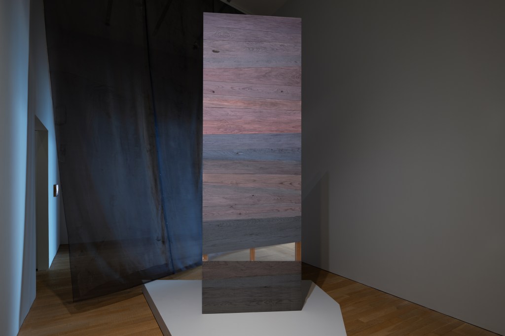 同样的“临摹”应用于胡晓媛几乎最有辨识度的代表系列“木”——她将绡覆于木板上,以墨描摹透出绡的木纹(《木》,2008);并由此持续演化,以漆覆盖木纹,再用钉把绘好木纹的绡平整地包裹木,成为它的“义肤”。直至此次展出的《木/秒杪》系列(2024),制作手法一以贯之,但体量与观感显出丰富的变化。