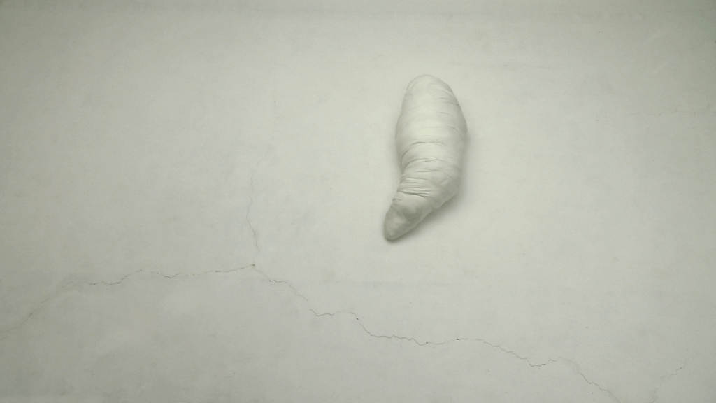 她曾在录像《没有为什么》(2010)中再现困于茧中的身体。实际上,她拍摄的不是一只蚕茧,而是裹着层层白布伪装成茧的一名女子。但是在她的镜头里,“人茧”的挣扎扭动与人们印象里破茧前的蚕如此相似。