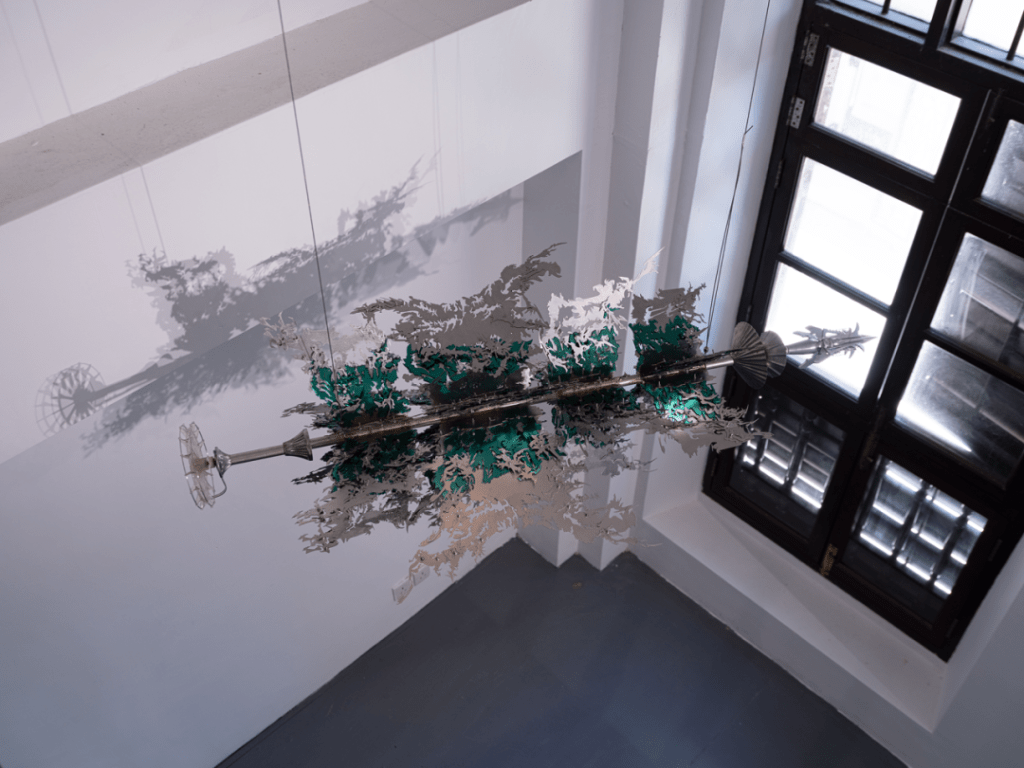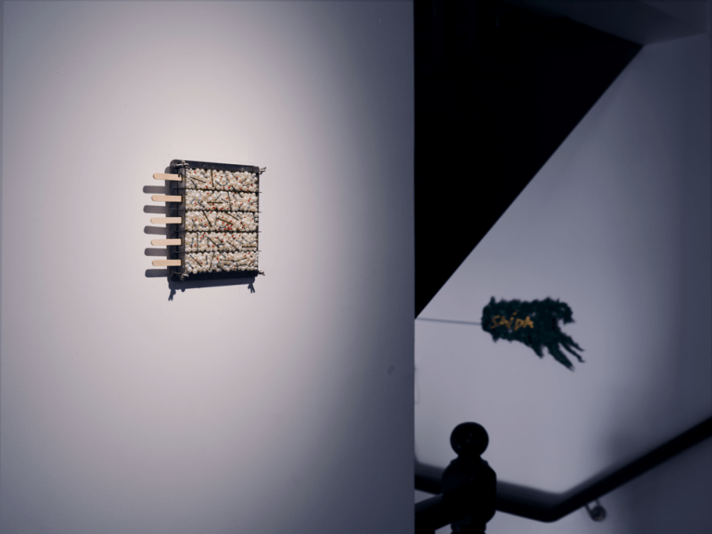 黄美婷根据这座双入口建筑的空间结构分布作品:右侧的单层空间(在澳门被称作“地下”)对应“水下”;而从左侧木门上楼梯后,来到分别对应地面和天空的二楼和三楼。装置《叠覆律》(2025)纵向“穿过“多层空间,这组主要由回收绝缘子串成的管状物,巧妙地将上下楼层贯通起来,好似钟乳石般,将楼层隔板变为匿名“地质层”。