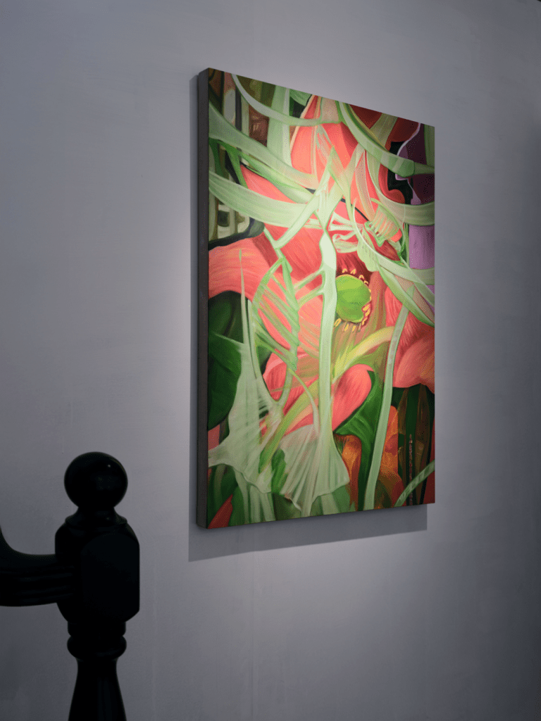 此次展出的五幅张双洋子的绘画都是今年的新创作。这批兼备具象与抽象审美特质的生物肖像,氤氲着生命热度,错综复杂的画面元素介于科幻与科研之间。我的目光有些不知所措地该如何跟随、捕捉画中形象,于是花蕊、叶片、毛刺、腔体都仿佛手脚般拂动着、浮动着。它们的色彩如热感或红外探测下的画面那般浓郁、甚至过曝,散发着魅惑的气息,拟写着渴望、焦躁、孤单、疲惫等种种情绪。