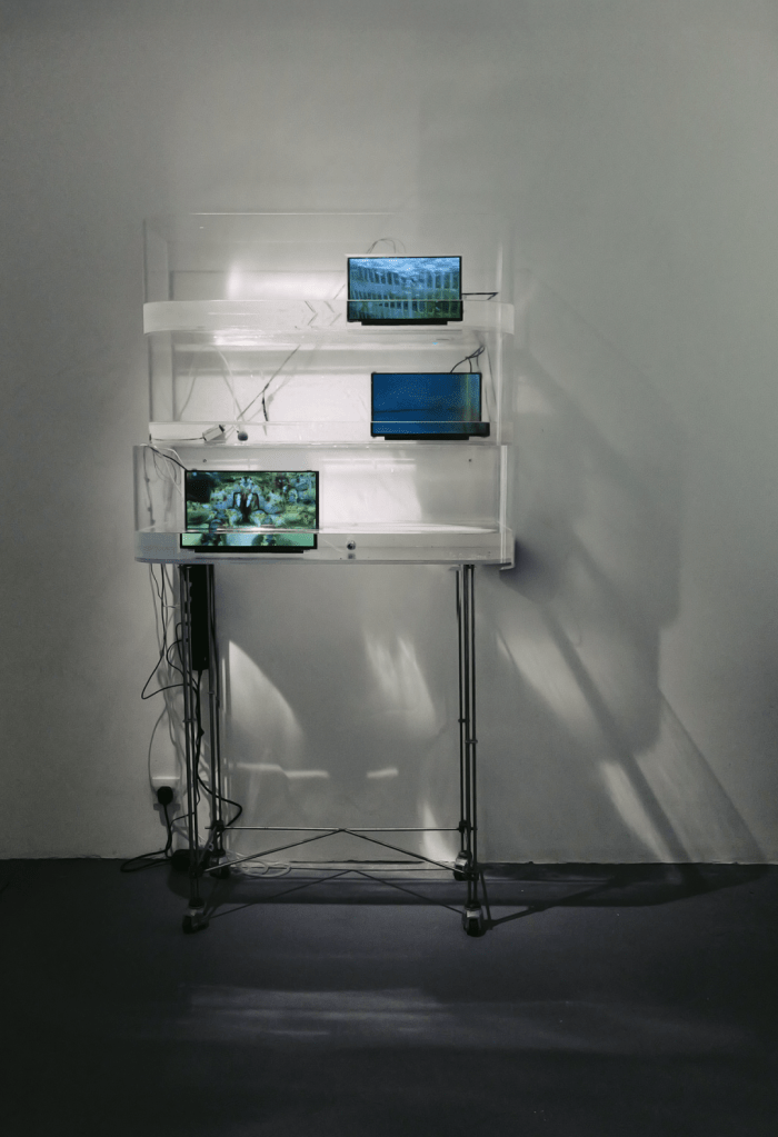 回到“水下”,驻足于《非在场标本系列-001》(2025)前,三层透明亚克力水族缸内分别装有一台屏幕与透明液体,左下角的画面中出现了“本店有生猛海鲜售卖”的广告。这类广告旁,通常就有临时养着鱼、蟹、龟等“食材”的水族缸。借用王小波在《红拂夜奔》中的尖锐话题,之于往来顾客,这些生动的缸体“既具有观赏性,也具有实用性”。而眼前“食材”被替换成影像,在其显著的视觉吸引力之外,也蕴藏着一种脑力层面的实用性。对比杨振中早在1996年就将电视机垒进鱼缸的录像装置《鱼缸》:如果电视画面上反复说着“我们不是鱼”的人嘴特写镜头,是对人之狭隘特殊性的强调或讽刺;那么黄美婷对鲁迪·卢克(Rudy Rucker)提出的《湿件》(Wetware,1988)构想的借用,则力图启发观者想象人类脑力(湿件)与编码化数据(软件)和机械系统(硬件)相互融合的超越性生命体系。从情感上,澳门之于她,已然成为了这一体系的生发地。