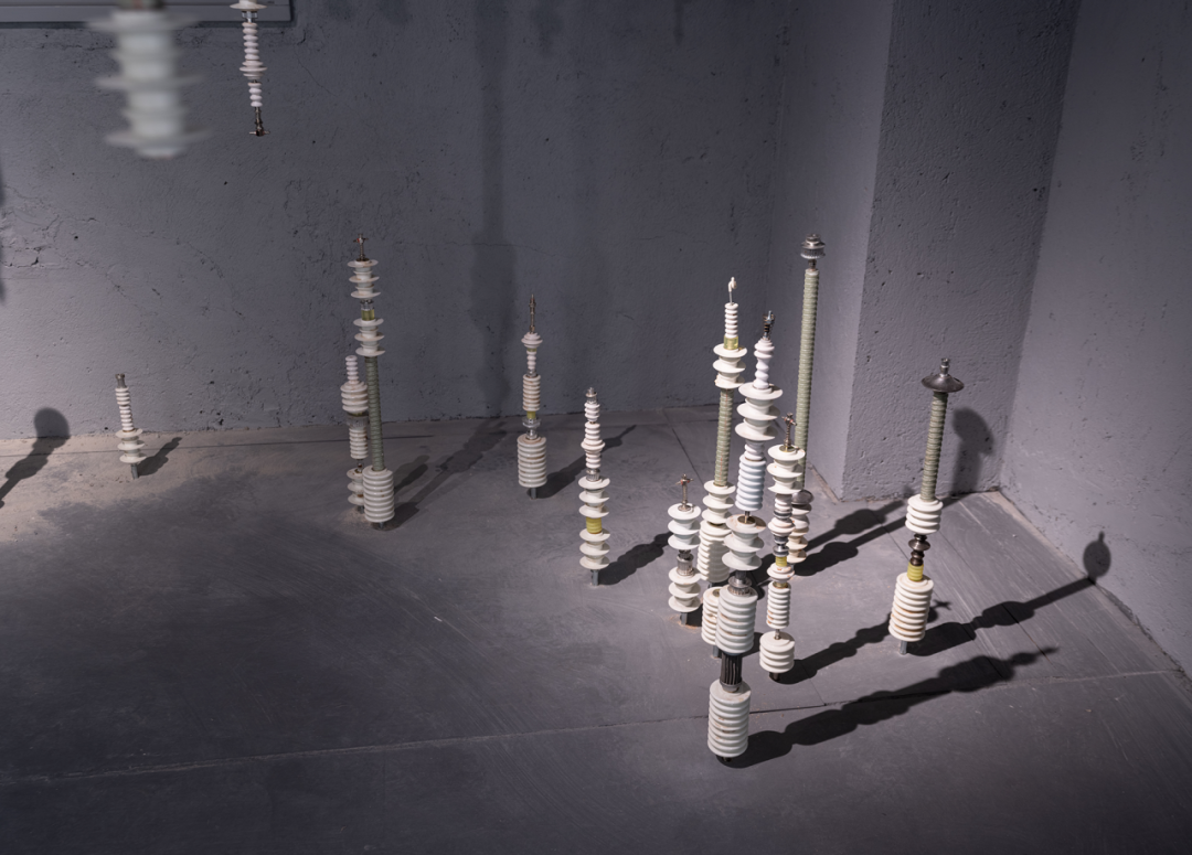 黄美婷根据这座双入口建筑的空间结构分布作品:右侧的单层空间(在澳门被称作“地下”)对应“水下”;而从左侧木门上楼梯后,来到分别对应地面和天空的二楼和三楼。装置《叠覆律》(2025)纵向“穿过“多层空间,这组主要由回收绝缘子串成的管状物,巧妙地将上下楼层贯通起来,好似钟乳石般,将楼层隔板变为匿名“地质层”。