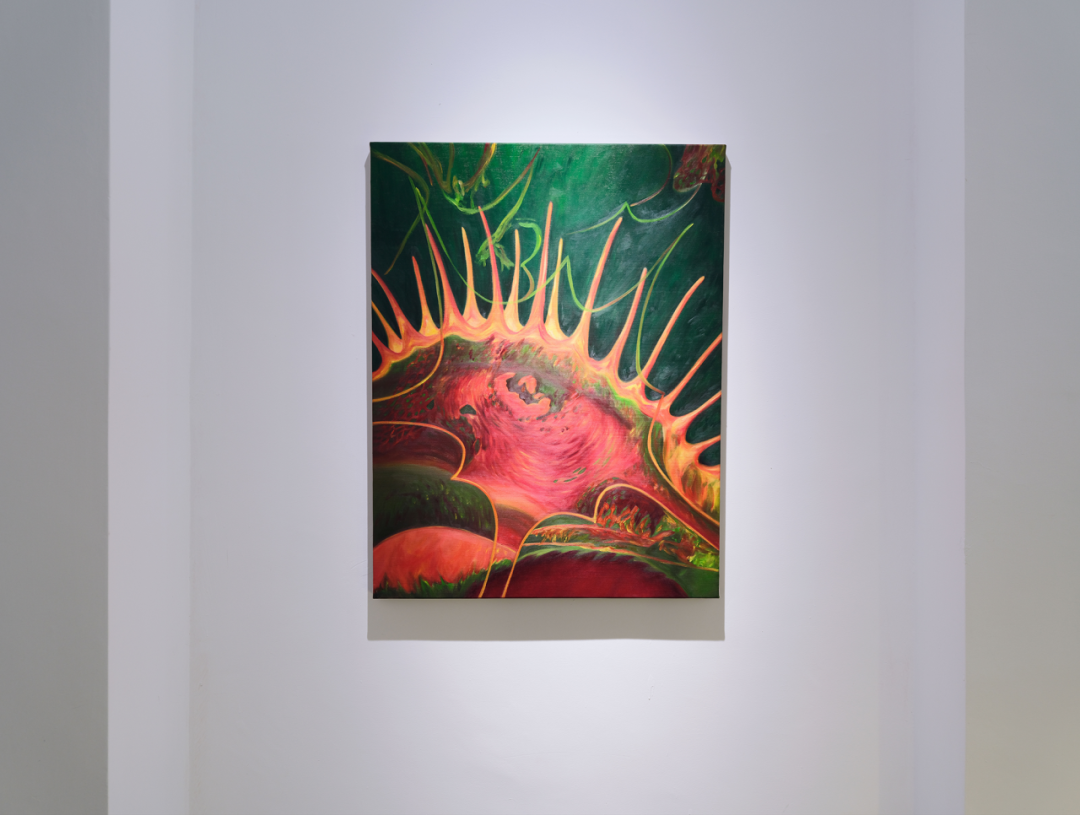 此次展出的五幅张双洋子的绘画都是今年的新创作。这批兼备具象与抽象审美特质的生物肖像,氤氲着生命热度,错综复杂的画面元素介于科幻与科研之间。我的目光有些不知所措地该如何跟随、捕捉画中形象,于是花蕊、叶片、毛刺、腔体都仿佛手脚般拂动着、浮动着。它们的色彩如热感或红外探测下的画面那般浓郁、甚至过曝,散发着魅惑的气息,拟写着渴望、焦躁、孤单、疲惫等种种情绪。