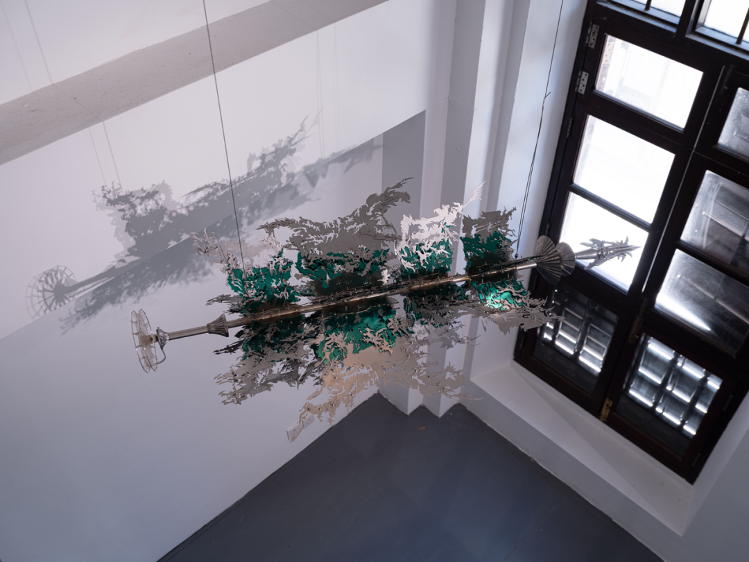 悬吊于空中的《云坐标》(2025)是黄美婷运用镭射切割技术镶接出的一支炫目的浮游“箭”。箭身图案既像是一片地形繁复的勘测图、亦模拟藻类不规则的密实绵延感。其形制或可追溯到她去年创作的《Saida》(葡语单词Saida意指“出口”),这件镭射切割墙面雕塑,意在描绘赛鸽遭遇迷途时扭曲、缺失的巡游路径。今次再用,另有一件同名作品(《出口》,2025),于层层叠叠的墨绿色镜面亚克力“浮藻”上,以黄色点状二极管灯泡拼写出“SAIDA”字样。这枚指向未知出口的灯牌,与那支瞄准窗外的坐标,都似在探寻当下科技生态世的潜在方向。